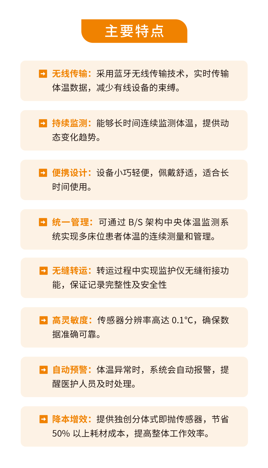 2.术后恢复:感染并发症早期预测 基于连续体温数据构建的机器学习模型,可挖掘术后感染性发热的体温特征,预测感染并发症风险,为抗生素使用与干预时机提供依据。 3.重症监护:危重症体温节律管理 在ICU中,系统可连续监测体温,对脓毒症、新冠等患者实现“体温-感染”联动预警,异常体温检出率达100%。 // 携手定义体温监测新时代! 现面向全国开放区域代理、医院渠道合作,携手掘金围手术期精准监测市场,抢占先机,共赢未来!以临床级无线测温技术共拓手术室与ICU蓝海,让中国智造守护生命温度! ![]() |